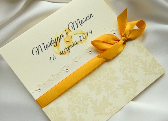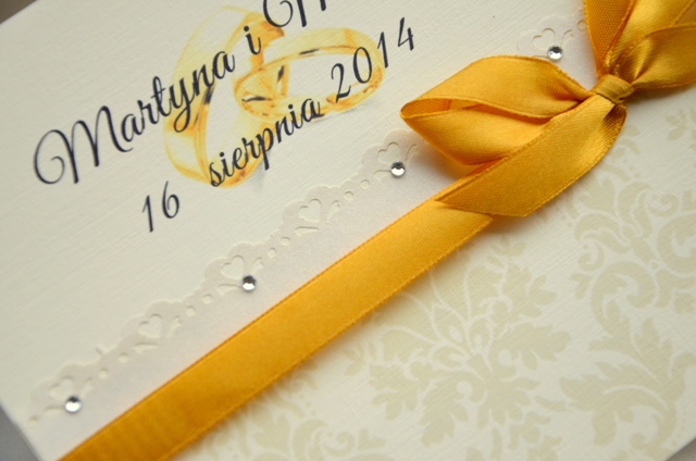 Zaproszenie wykonane na tłoczonym papierze - kremowy papier z fakturą płótna. Ozdobione papierową koronką, cyrkoniami 3 mm oraz kokardą. Możliwości wyboru koloru wstążki.