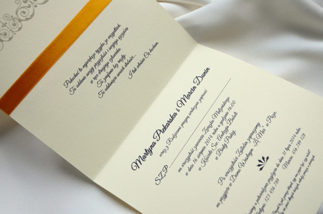 Dowolna treść zaproszenia, ustalana na etapie projektu. Całość zamknięta w kopercie dopasowanej formatem do zaproszenia. Wszystkie elementy są zamocowane, gotowe do wręczenia.