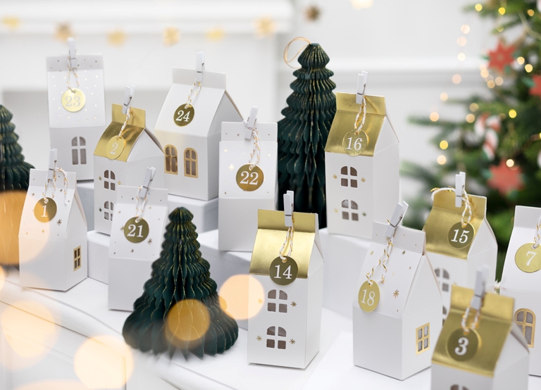 - 24 papierowe zawieszki w kolorze złotym metalizowanym z białym nadrukiem numerów od 1 do 24