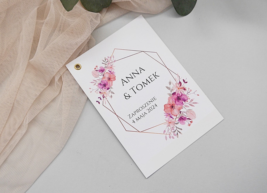 Zaproszenie wydrukowane na sztywnym papierze z matowym wykończeniem w gramaturze 300g. Dowolna treść zaproszenia ustalana na etapie indywidualnego projektu.