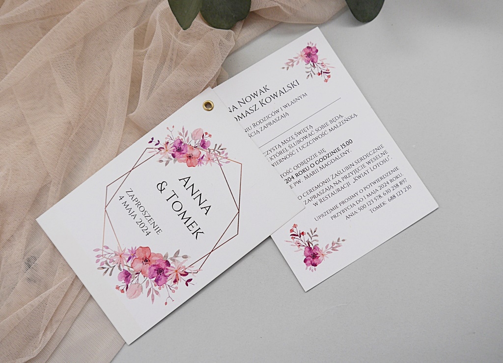 Do zaproszenia można dokupić wszystkie potrzebne elementy papeterii i dekoracji: winietki, zawieszki, księgę gości, pudełko na obrączki czy koperty, itd.