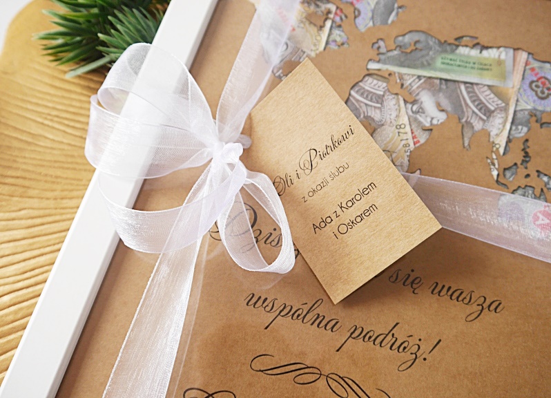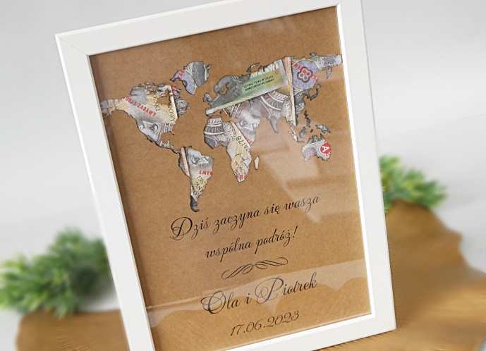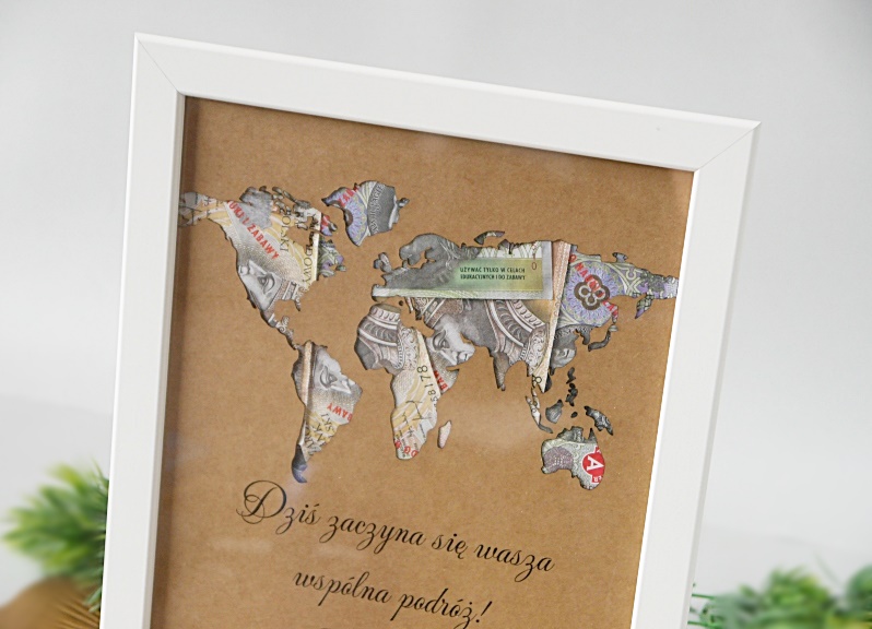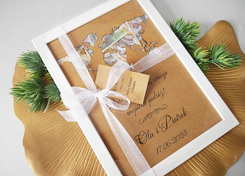 Zaskocz młodą parę wspaniałym prezentem na ślub zamiast tradycyjnej koperty. Ramka z mapą świata będzie piękną pamiątka/obrazem na długie lata. Efekt WOW gwarantowany. Ta forma wręczenia prezentu na pewno się wyróżni wśród tradycyjnych kopert.