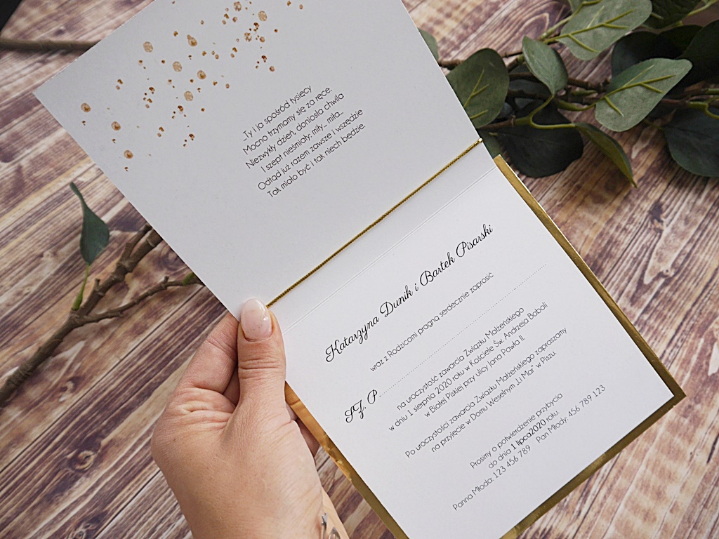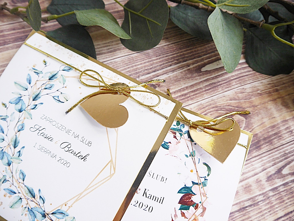 Zaproszenie wykonane z papieru o matowym wykończeniu - 300g., na złotej podstawie. Zaproszenie jest bardzo sztywne, żywe kolory w wydruku led. Do każdej sztuki sznurek oraz przywieszka serca złotego do samodzielnego zawiązania. W komplecie sznurek. Dowolna treść zaproszenia, ustalana na etapie projektu. Całość zamknięta w kopercie dopasowanej formatem do zaproszenia.