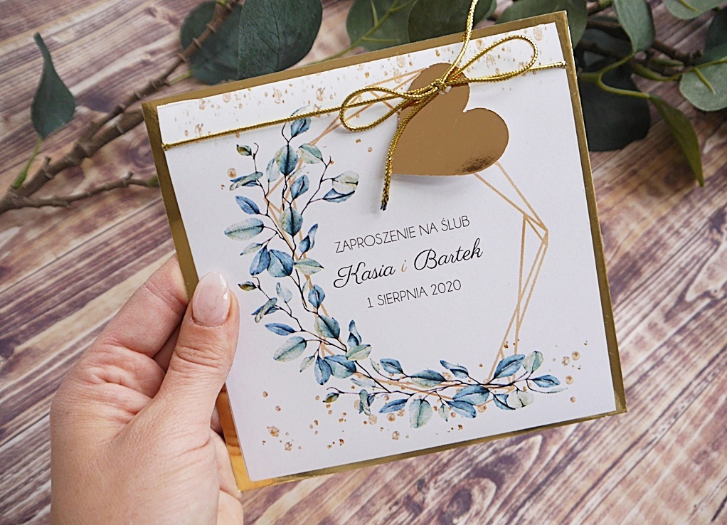 Zaproszenie na ślub ze złotem serce GERTI 2 kwadratowe