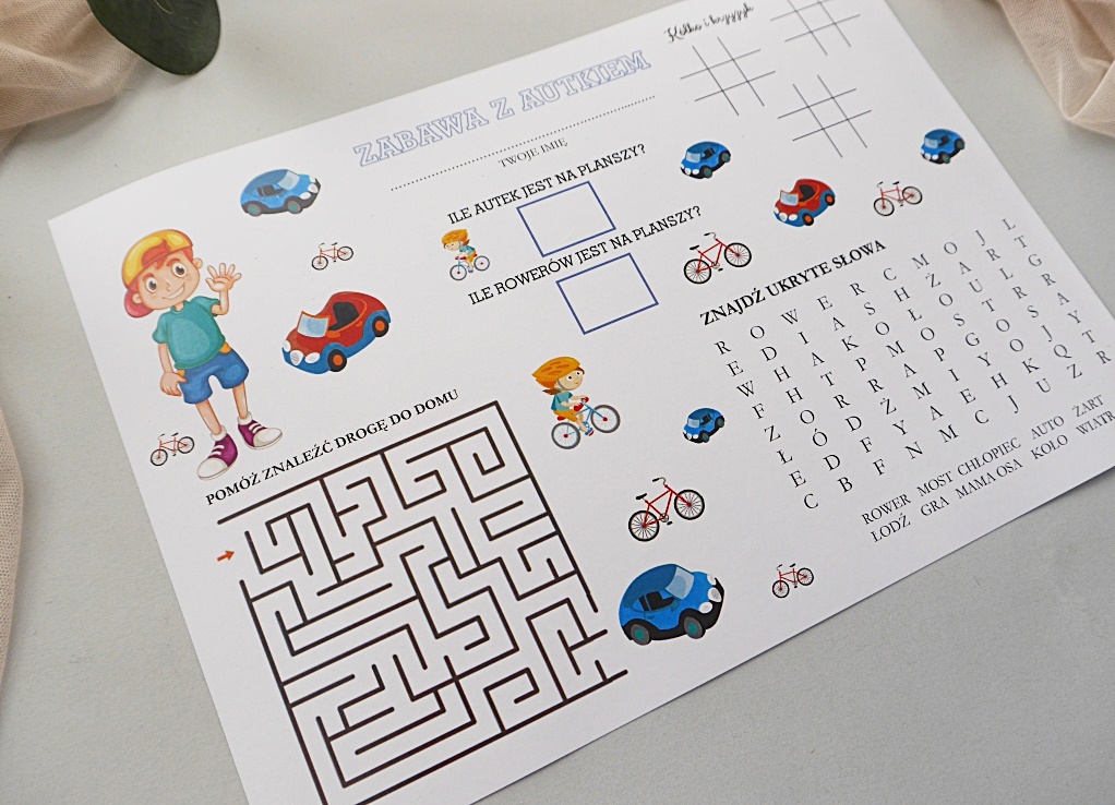 Zabawy: labirynt, kółko i krzyżyk, liczenie, łamigłówka słowna - znajdź słowa. Karta posiada miejsce na wpisanie imienia.