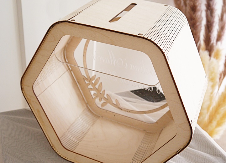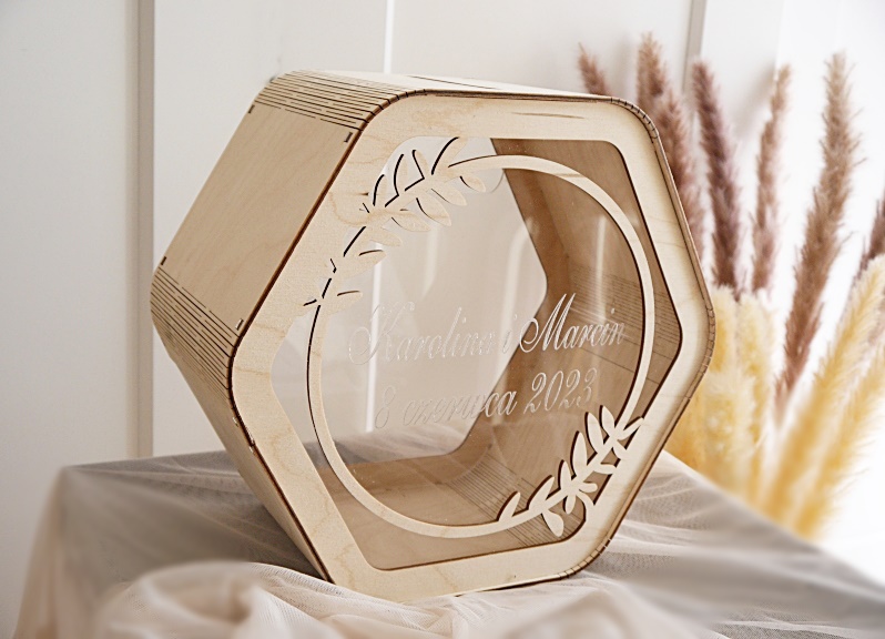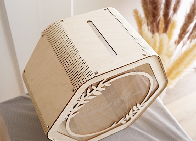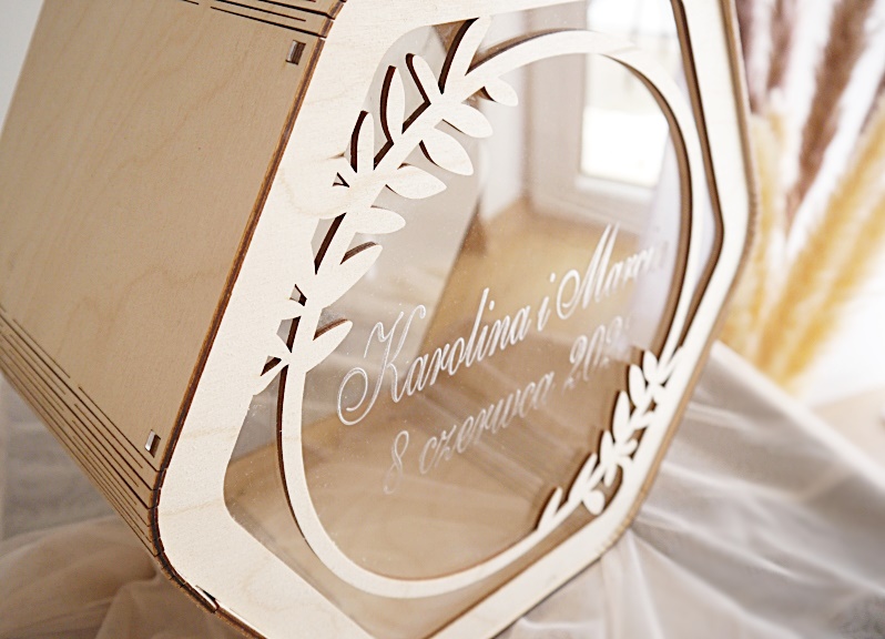 Miejsce na wrzucanie kopert. Z tyłu otwór, by było można wyciągnąć zawartość. Wspaniała pamiątka, w której będzie można przechowywać ślubne pamiątki. Istnieje możliwość zmiany materiału np. na biały hdf.