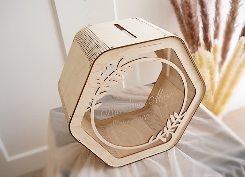 Piękne pudełko/skrzynka na koperty. Jeśli szukasz nietypowego wzoru, ta oferta jest dla Ciebie. Domek wykonany z dwóch materiałów, sklejka oraz plexi. Grawer twoich imiona oraz daty. Na życzenie w cenie dodamy napis Dziękujemy.
