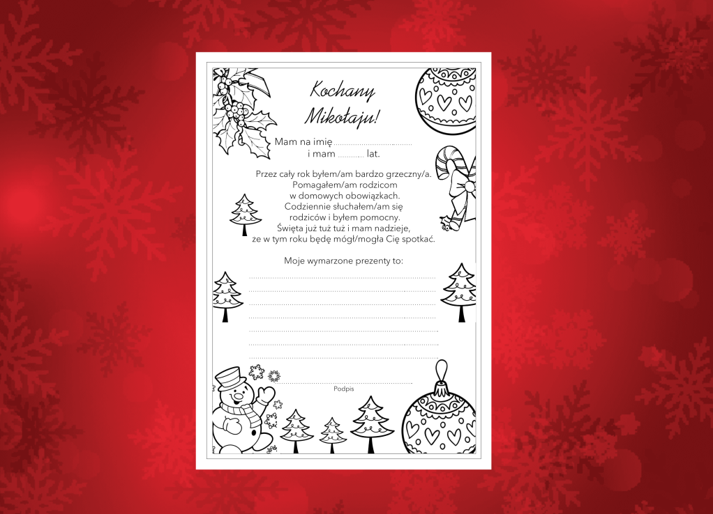 Spraw swojemu dziecku oraz sobie radość i napiszcie wspólnie LIST DO ŚWIĘTEGO MIKOŁAJA. Można go dowolnie pokolorować np. flamastrami.