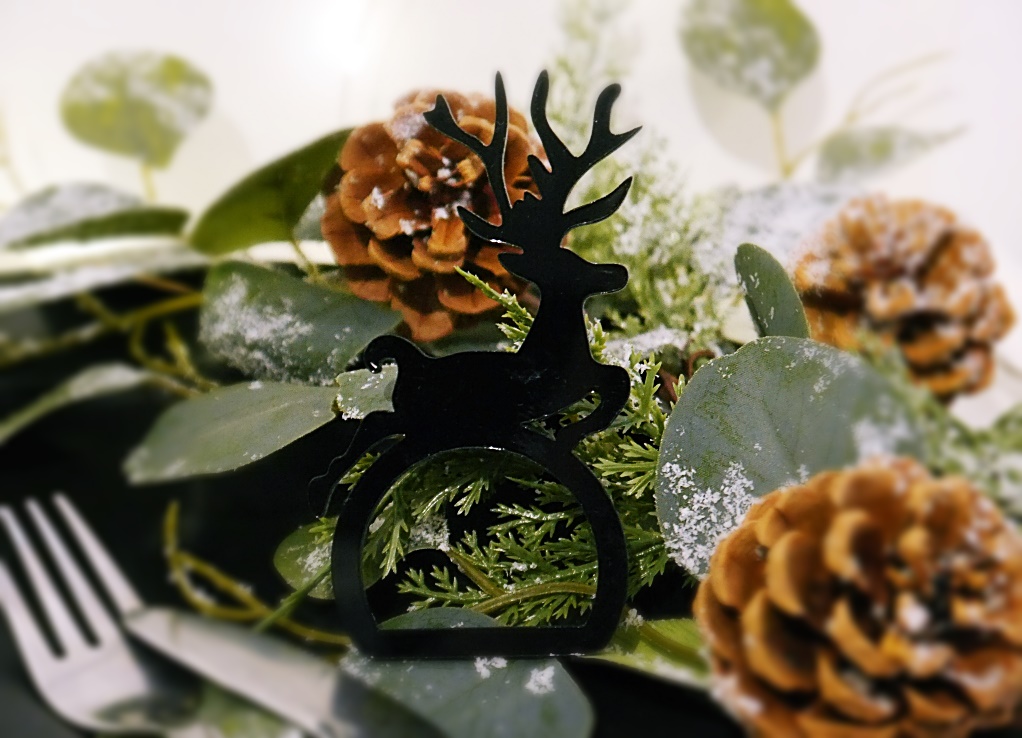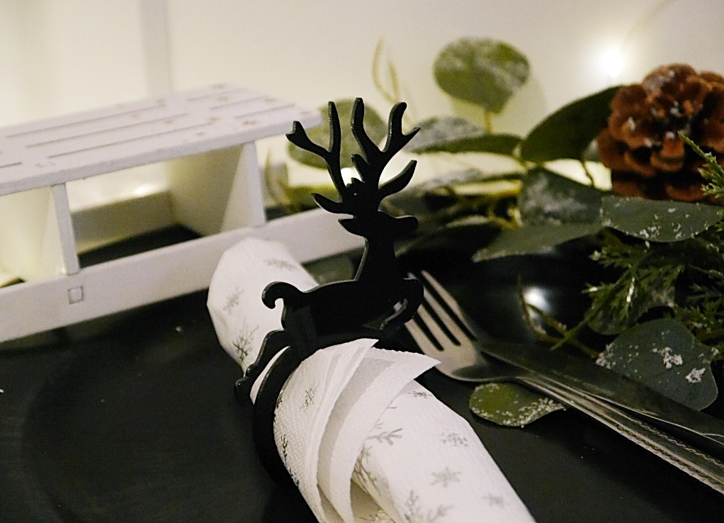 Obrączki na serwetki wykonane z plexi, przygotowane w kształcie koła z reniferem, to piękna propozycja na dekorację świątecznego stołu i pomysł na składanie serwetek.