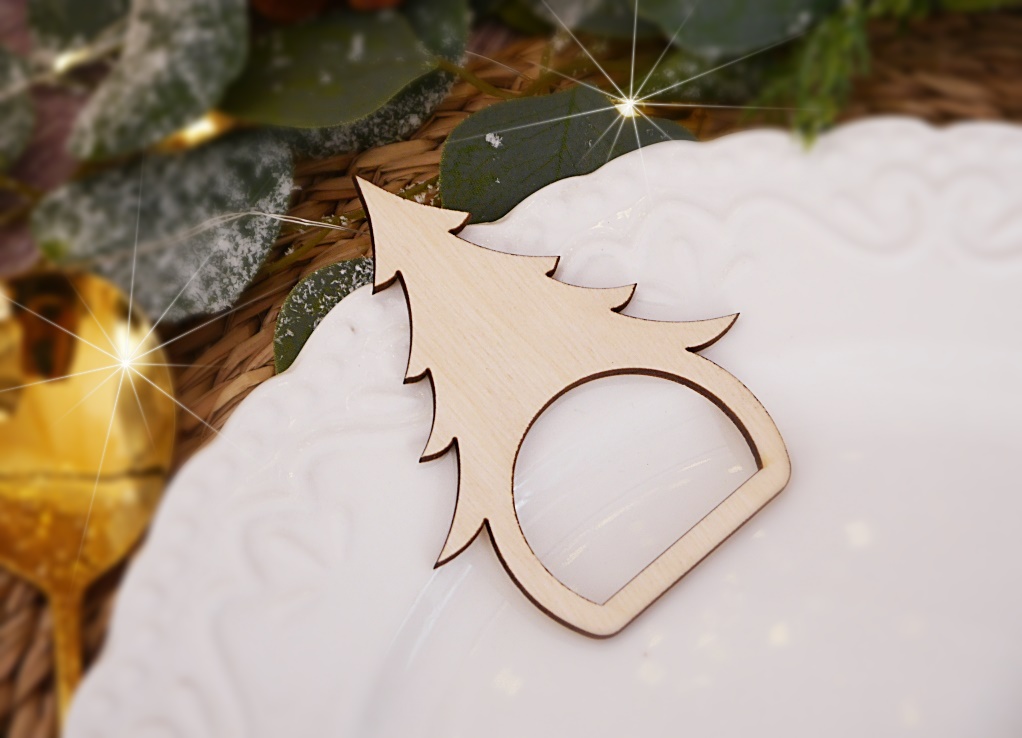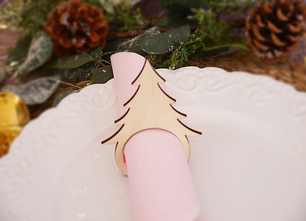 Obrączki na serwetki wykonane z drewna, przygotowane w kształcie koła z choinką. To piękna propozycja na dekorację świątecznego stołu i pomysł na składanie serwetek.