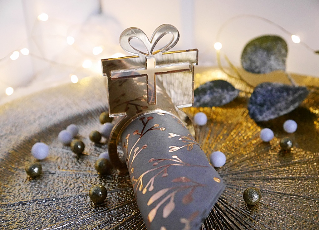 Obrączki na serwetki wykonane z plexi, przygotowane w kształcie koła z prezentem. To piękna propozycja na dekorację świątecznego stołu i pomysł na składanie serwetek.