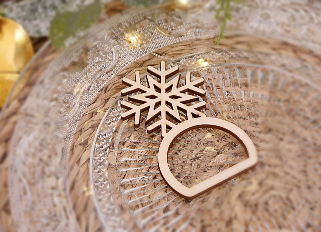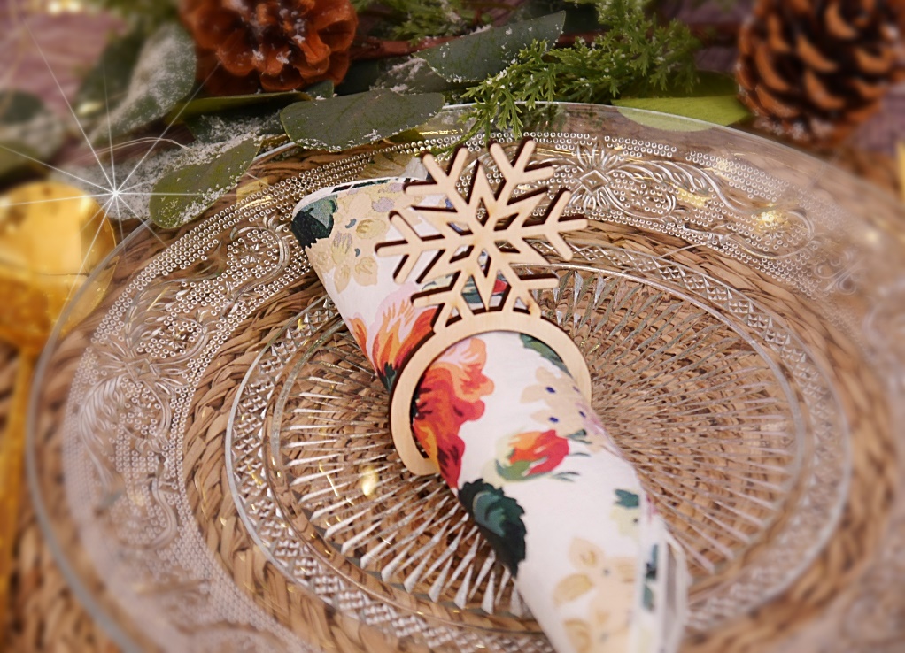 Obrączki na serwetki wykonane z drewna, przygotowane w kształcie koła ze śnieżynką. To piękna propozycja na dekorację świątecznego stołu i pomysł na składanie serwetek.