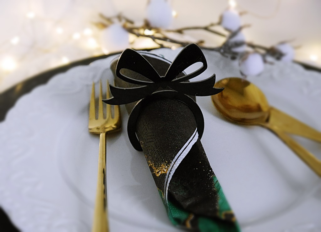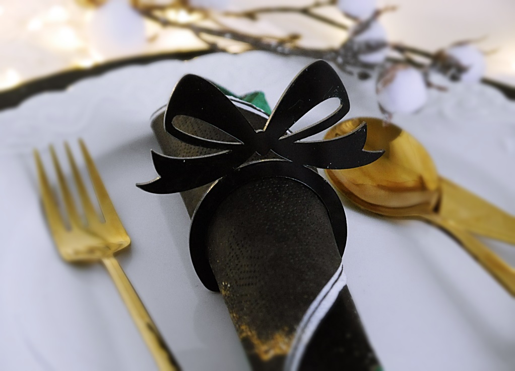 Obrączki na serwetki wykonane z czarnej lub białej plexi, przygotowane w kształcie koła z prezentem. To piękna propozycja na dekorację świątecznego stołu i pomysł na składanie serwetek.