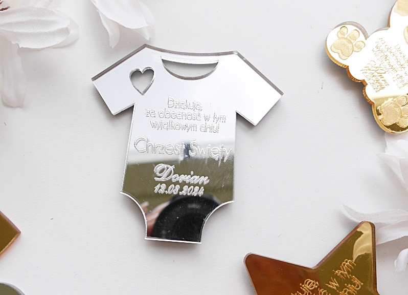 Cena dotyczy 1 sztuki magnesu wraz z białym woreczkiem. Tekst jak na zdjęciach + grawer dowolnego imienia oraz daty. Idealne na podziękowanie z okazji chrztu/roczku.