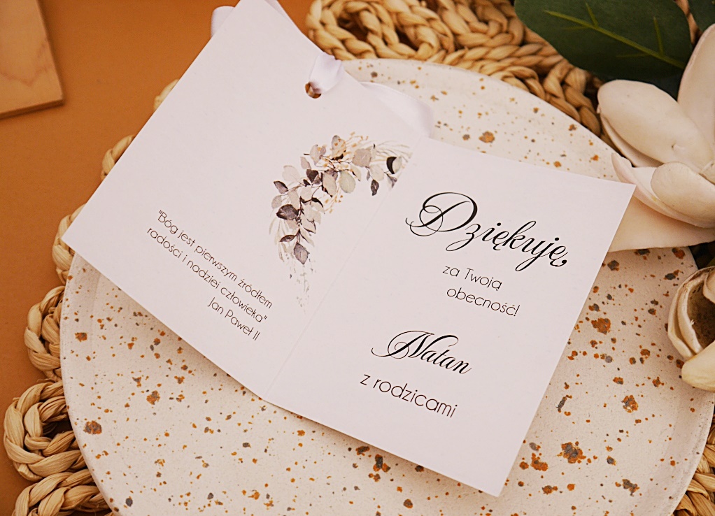 Podziękowanie dla gości z okazji komunii - RÓŻANIEC Z ETYKIETĄ zielone liście