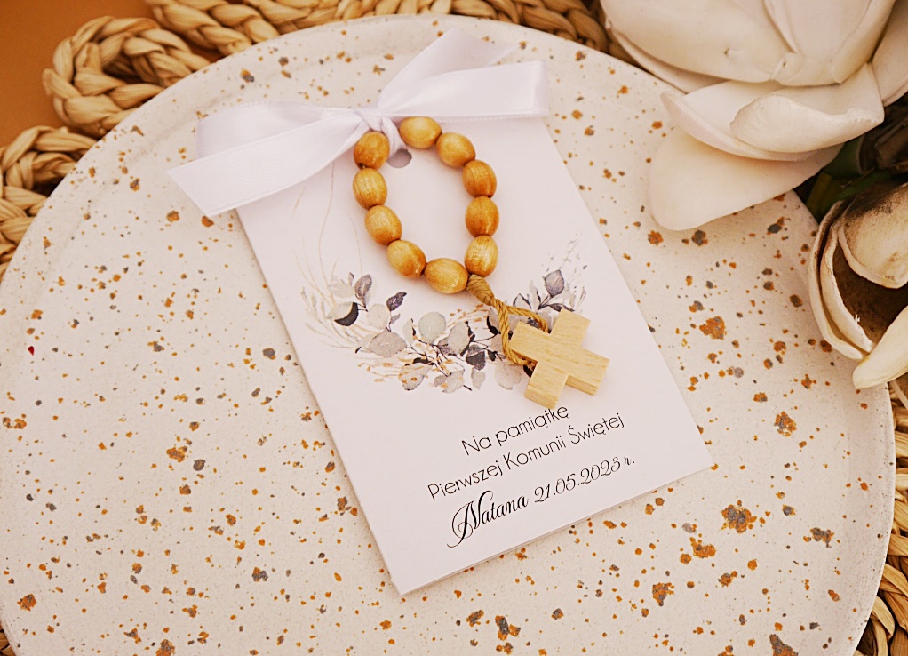 - różaniec zamocowany za pomocą kokardy z satynowej wstążki