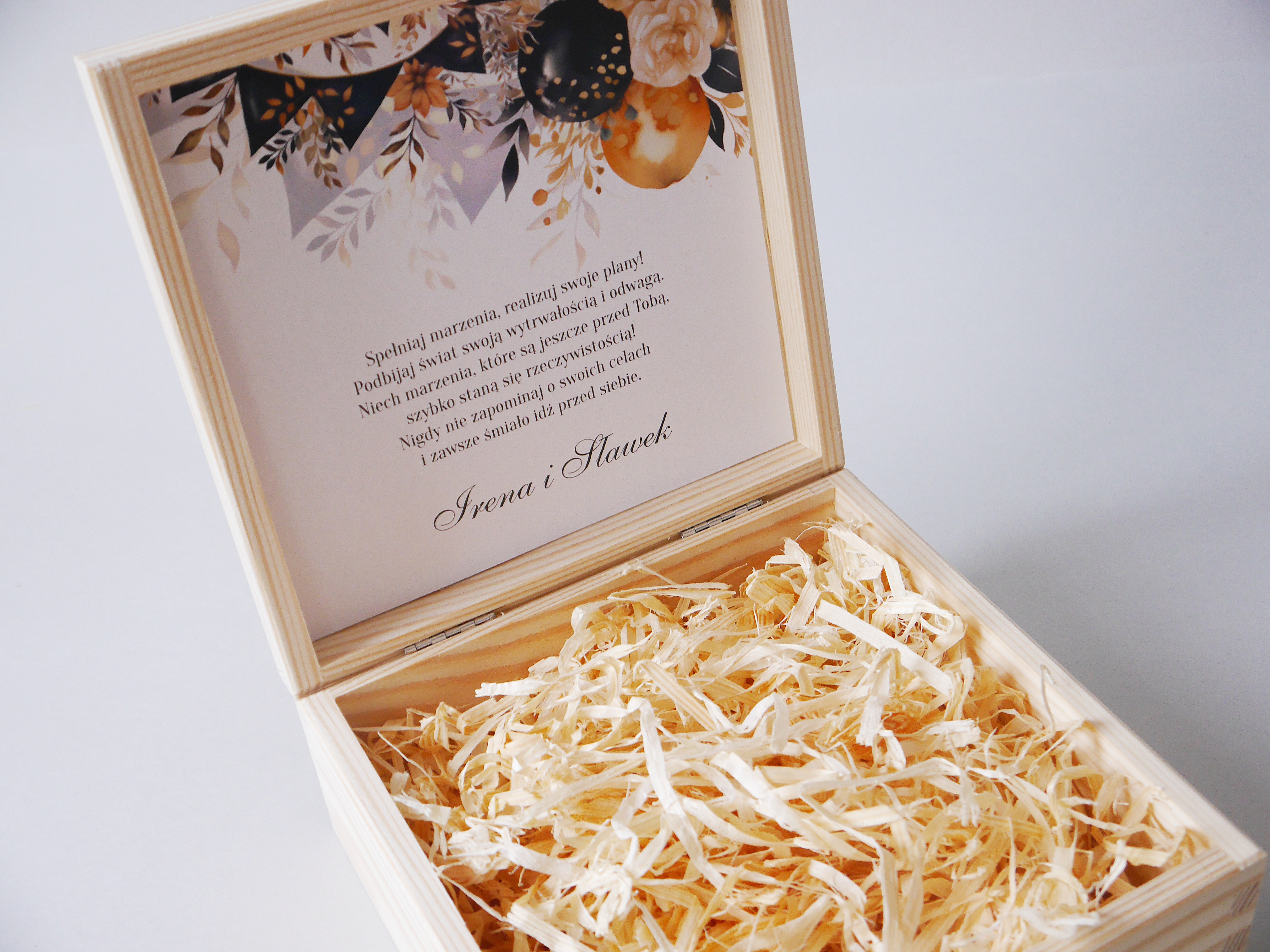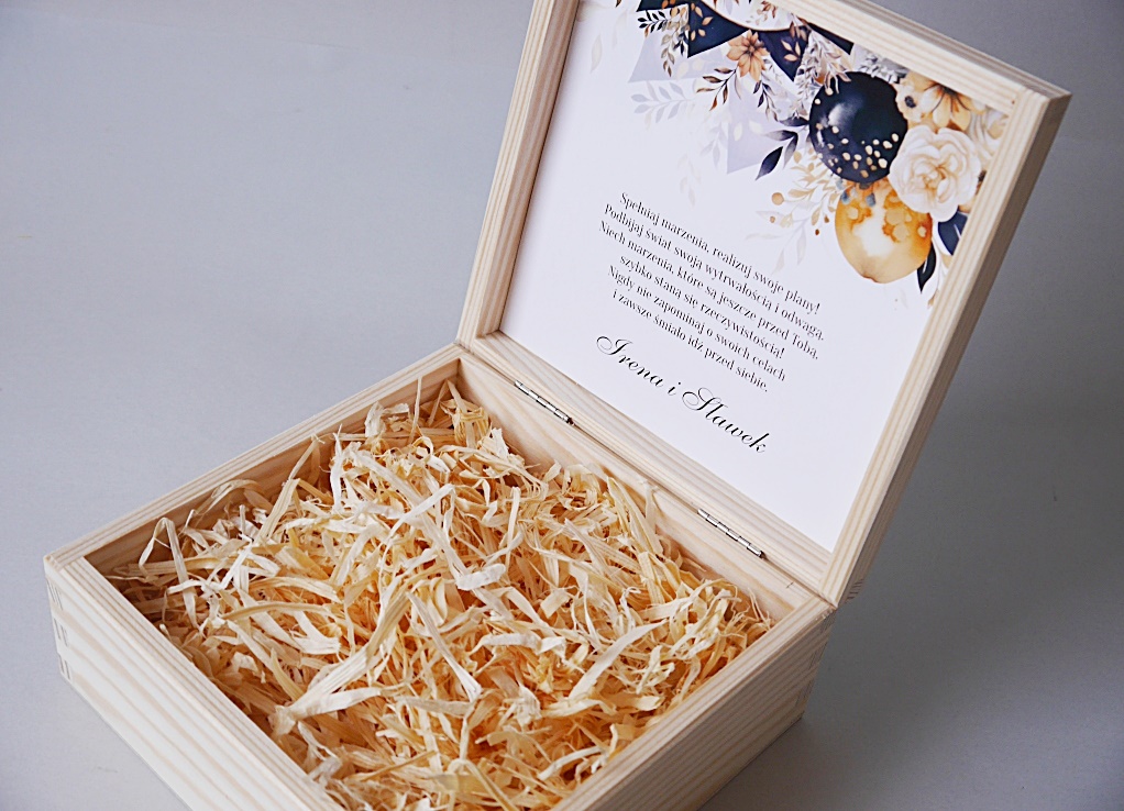 Skrzynka to eleganckie pudełko wraz z grawerem na wieku oraz z życzeniami w środku. Do samodzielnego uzupełnienia. Istnieje możliwość dokupienia zawartości.