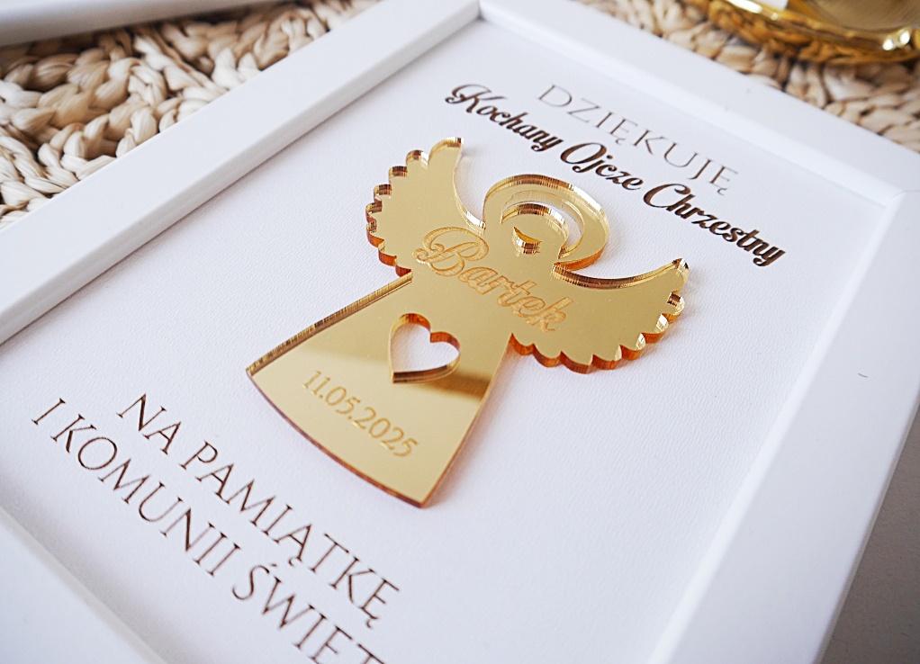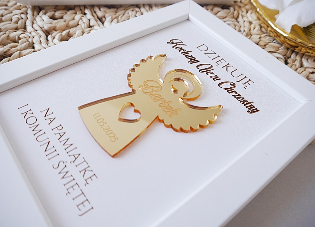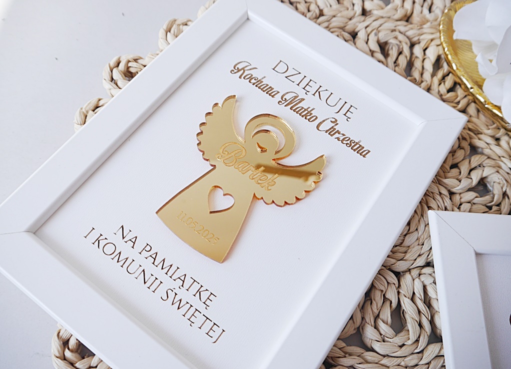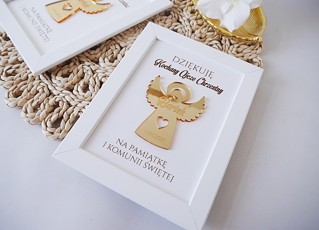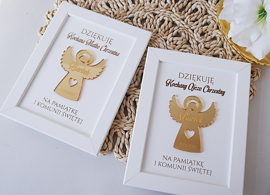 Z okazji Pierwszej Komunii Świętej jako podziękowanie dla Chrzestnych lub Dziadków - eletancka z ramka z aniołkiem z plexii.