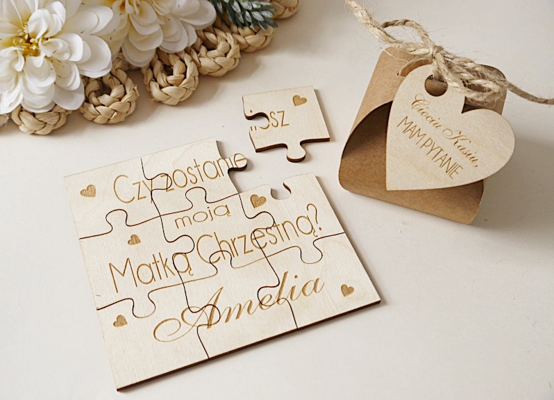 Ciekawa forma zapytania dla chrzestnej, puzzle w kartonowym pudełku. Na serduszku napis Ciociu + imię MAM PYTANIE. Do zestawu sznurek do przywiązania serduszka.