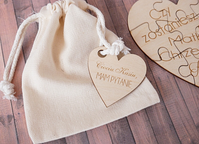 Ciekawa forma zapytania dla chrzestnej, puzzle w woreczku. Na serduszku napis Ciociu + imię MAM PYTANIE.