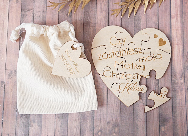Puzzle w kształcie serca z napisem: Czy zostaniesz moją Matką Chrzestną+ imię dziecka.