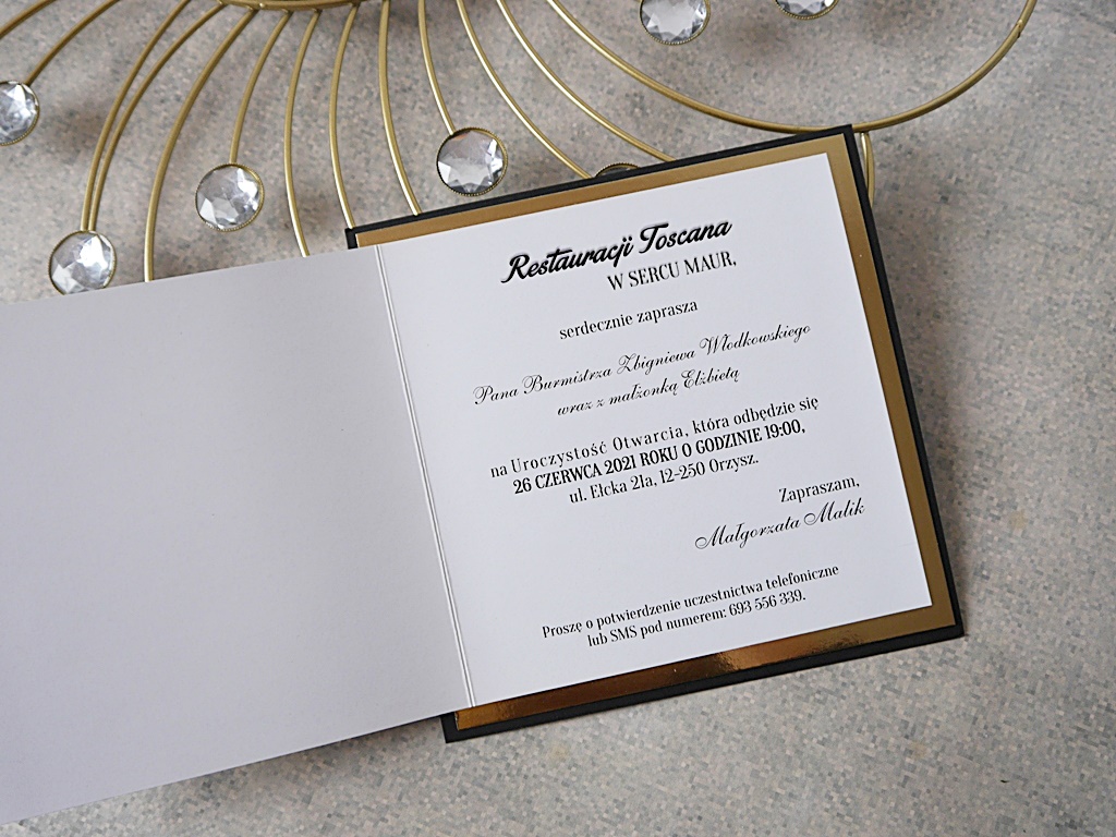 Zaproszenie wykonane na białym papierze z dodatkiem złota. Projekt oraz dane są dopasowane do potrzeb klienta. Logo zostanie nadrukowane w wybranych kolorach.