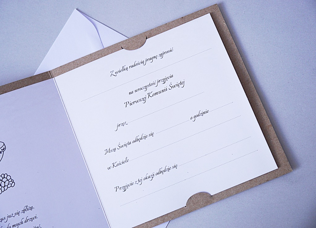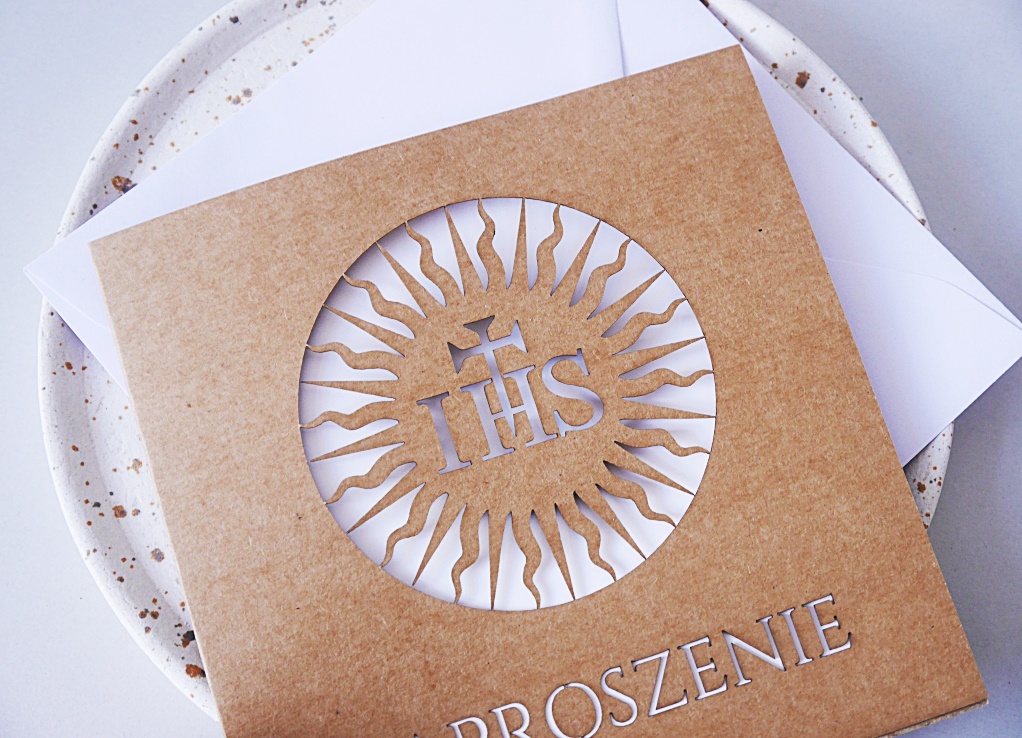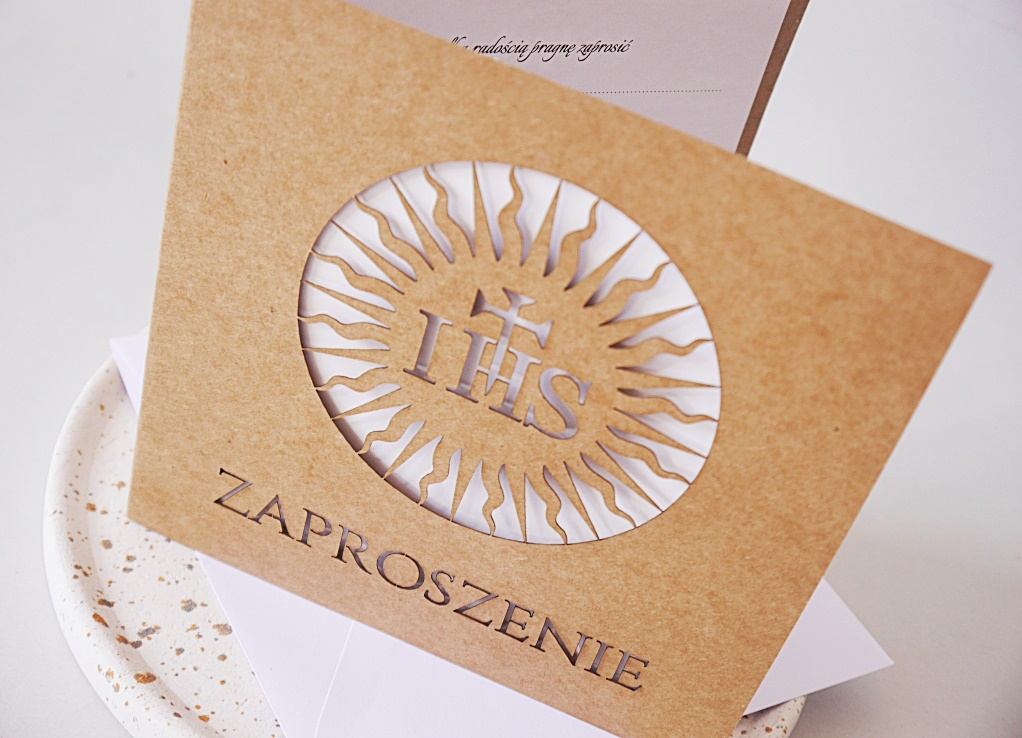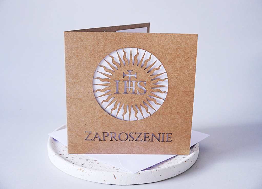 Zaproszenie EKO KRAFT komunijne, wycinane laserowo z gotowym tekstem do wypisania
