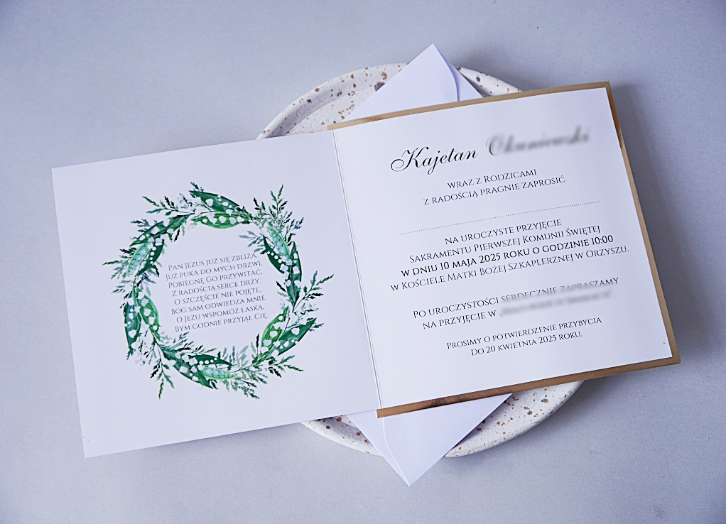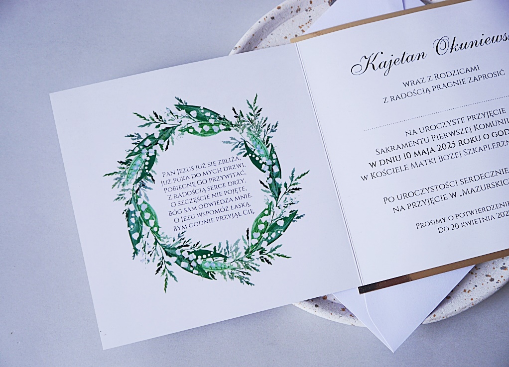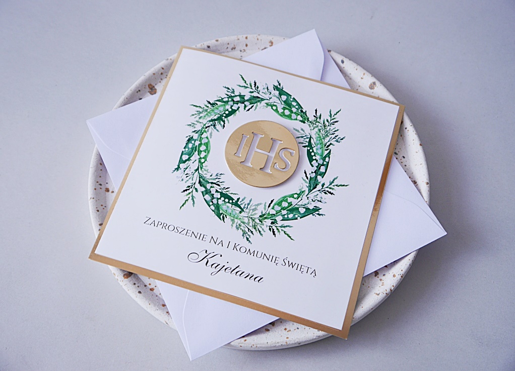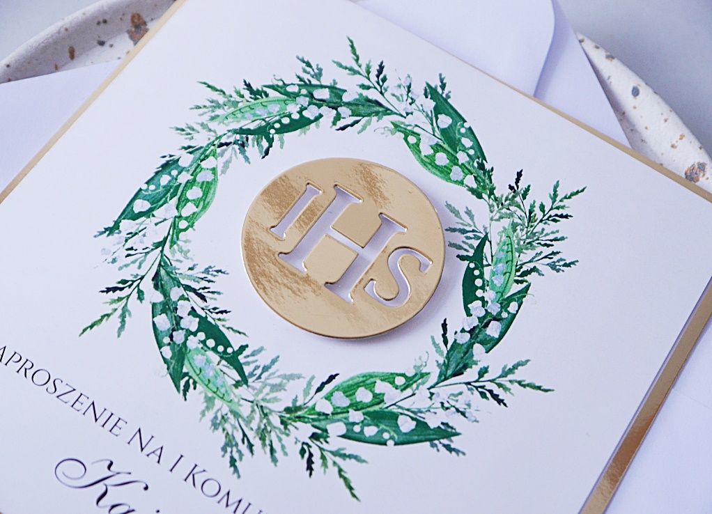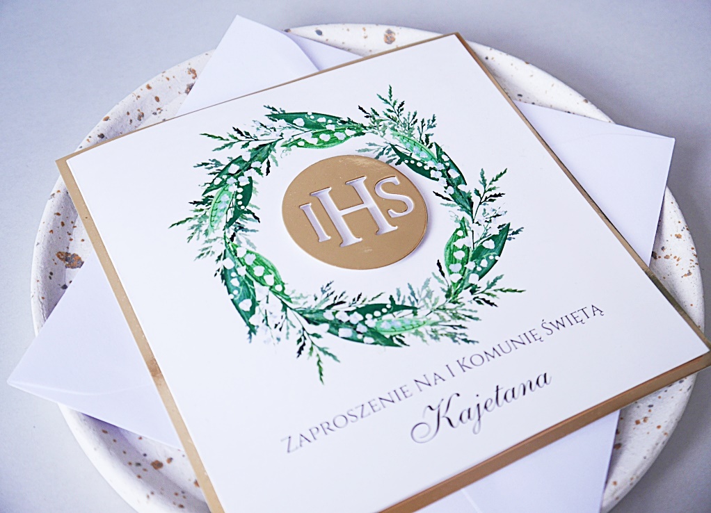 Zaproszenie wykonane na białym papierze wraz ze złotą podstawą. Wianek z konwalii otula hostię, która jest w formie wypukłej.