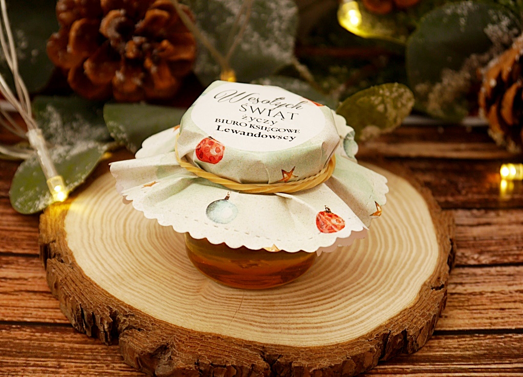 Na miodku napis Wesołych Świąt + dowolne logo lub podpis.