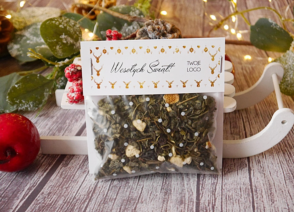 Symboliczny upominek - herbata w etui z twoim logo lub podpisem.  Z tyłu umieścimy życzenia z oferty lub inne od klienta.