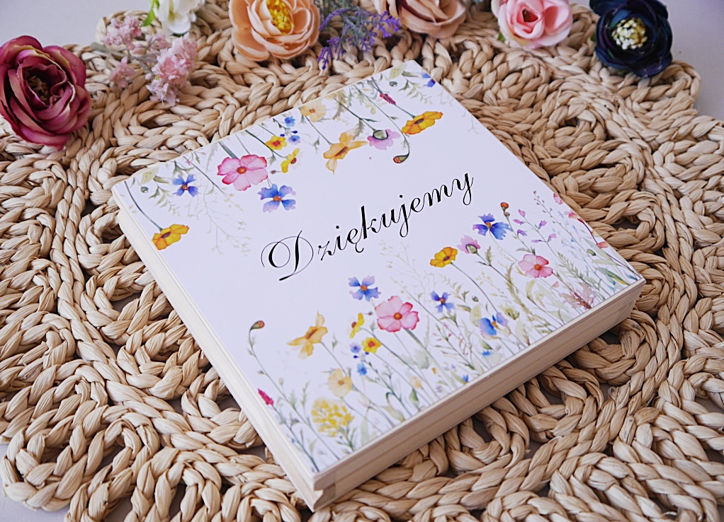 szkatułka w rozmiarze 14,8/14,8 cm, na wieku ozdobna etykieta z grafikami i napisem Dziękujemy