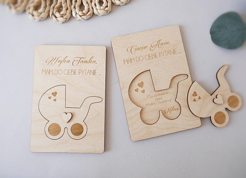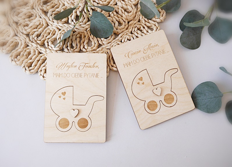 Drewniane zapytanie z grawerem w pełni speronalizowane. Prośba umieszczona pod wózkiem.