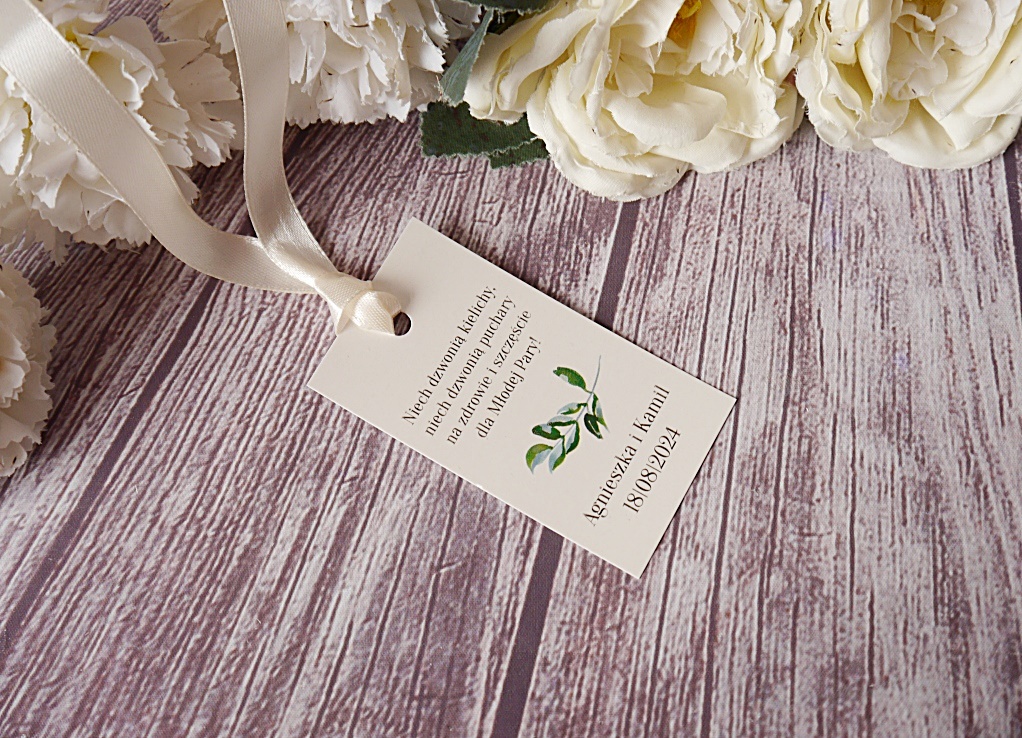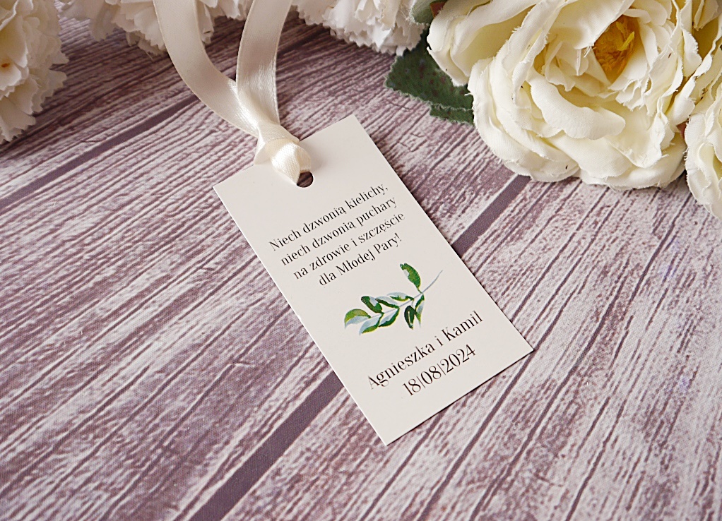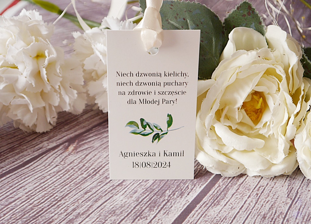 Zawieszka na alkohol weselny, możliwość wyboru tekstu oraz koloru wstążki do zawieszenia. Teksty drukujemy przy układzie 10 sztuk = 1 tekst. Na zawieszkach mogą zostać nadrukowane same imiona lub imiona z datą. Przy zakupie produktu możliwa realizacja ekspres.