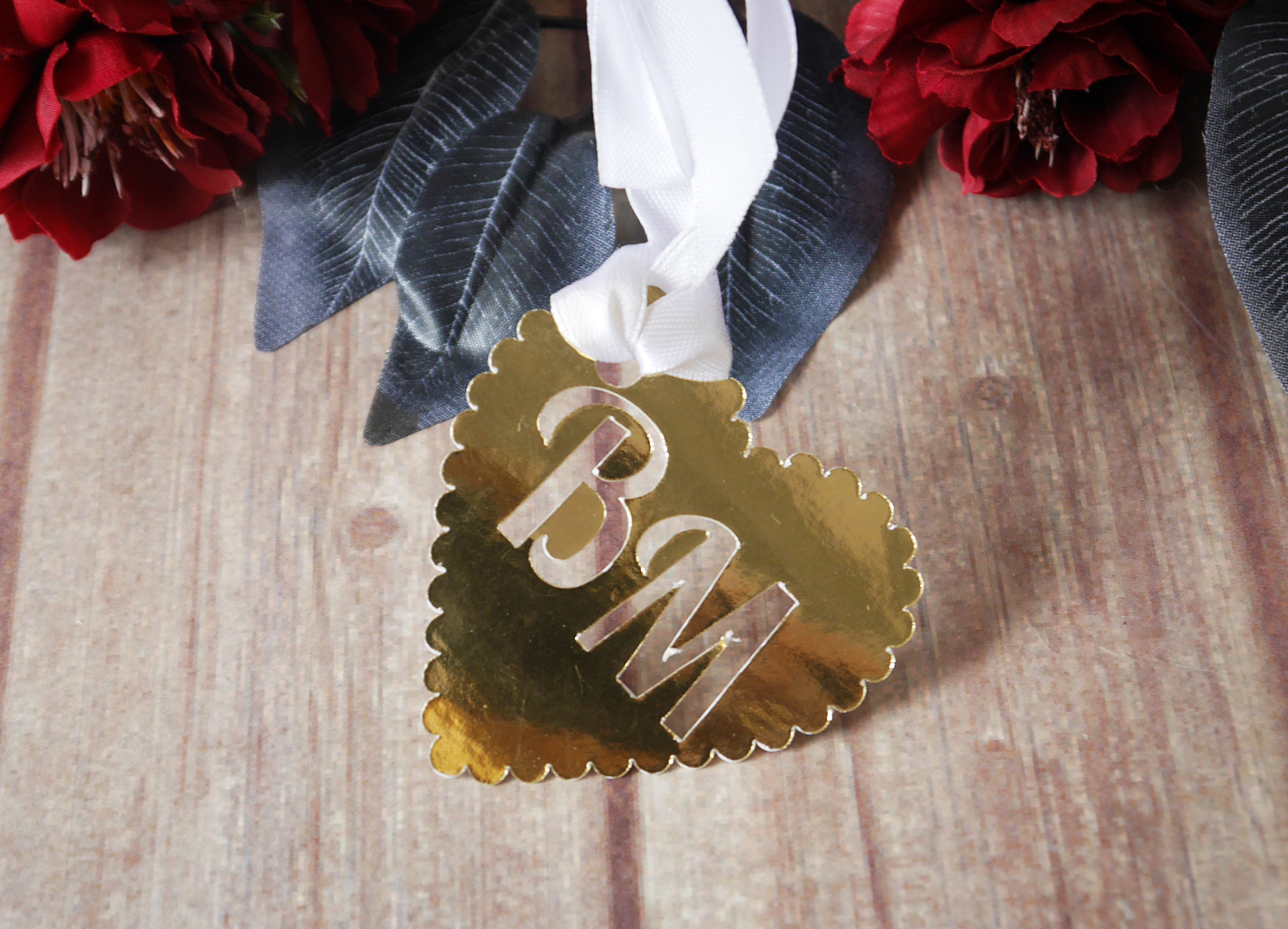 Zawieszka na alkohol weselny z inicjałami. Zawieszka złota, delikatna w kształcie serca. Przy zakupie produktu możliwa realizacja ekspres.